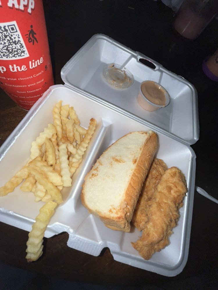 3 Chicken Fingers 1 Cane's Sauce® Crinkle-Cut Fries Texas Toast 22oz Fountain Drink/Tea1050 - 1480 Cal