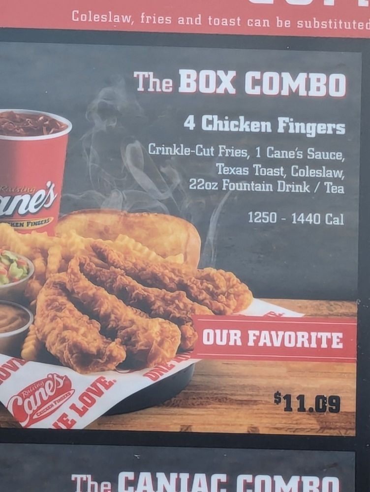 4 Chicken Fingers, 1 Cane's Sauce®, Crinkle-Cut Fries, Texas Toast, 22 oz. Fountain Drink. 1290-1720 cal.